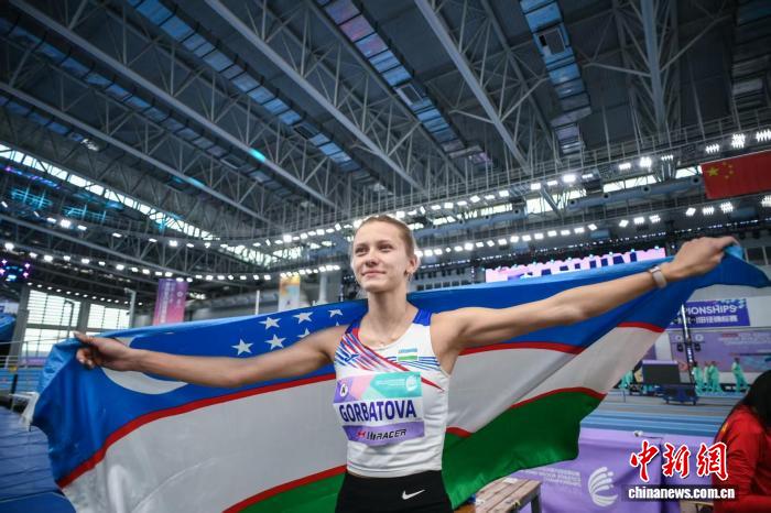 2月8日,天津,乌兹别克斯坦选手瓦列里娅·戈尔巴托娃在获得冠军后庆祝。当日,在第十二届亚洲室内田径锦标赛女子跳高决赛中,她以1.87米的成绩获得冠军并刷新个人最好成绩。 中新社记者 佟郁 摄