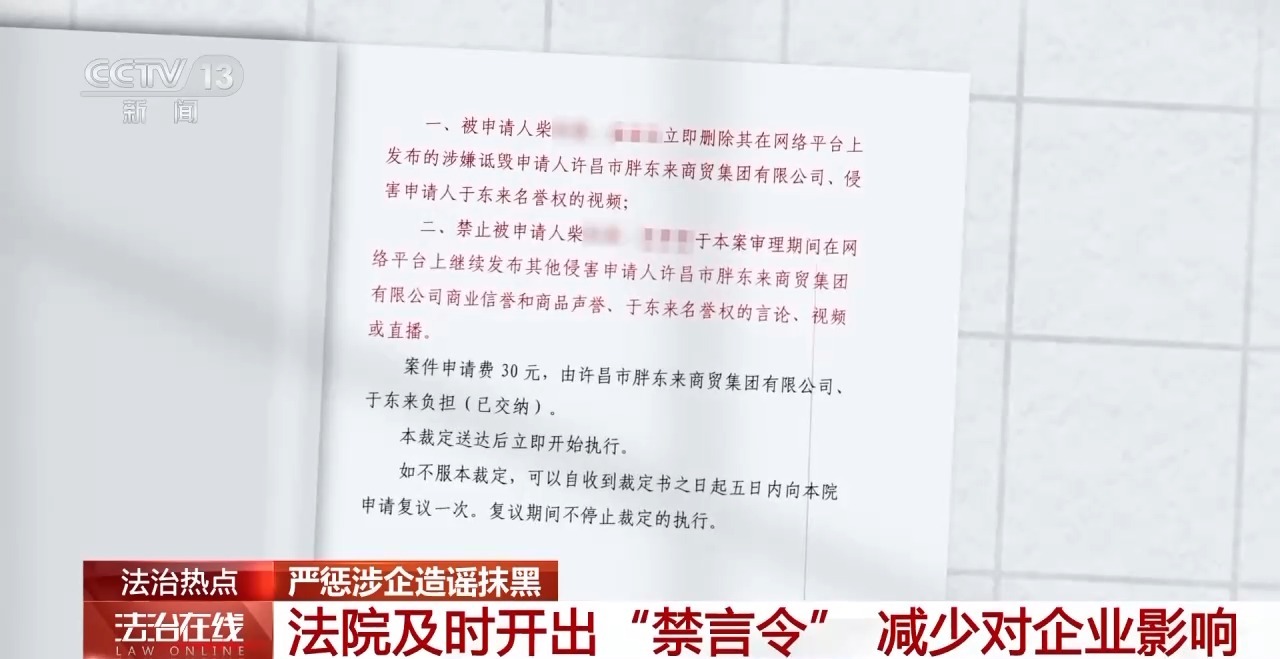 许昌市中级人民法院民事审判第五庭副庭长 李兵:这是河南法院网络侵权的第一份行为保全禁言令,它及时切断了链接,避免企业可能会在最后判决的时候赢了官司,但是因为没有及时制止舆论发酵,导致输了市场。