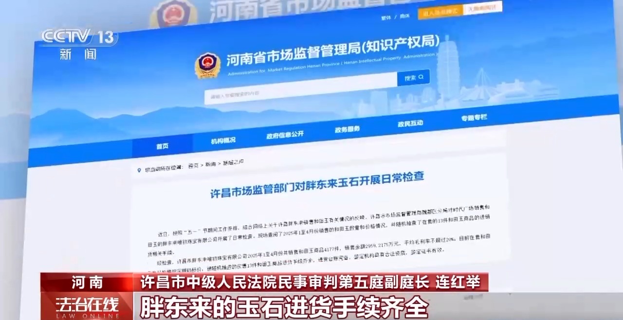 许昌市中级人民法院民事审判第五庭副庭长 连红举:我们在审查证据中发现柴怼怼在账号中发布了有大量的视频中指向胖东来玉石产品,许昌市市场监管局检查后发现,胖东来的玉石进货手续齐全,平均毛利率不超过20%。柴怼怼所说明显是编造的虚假信息。