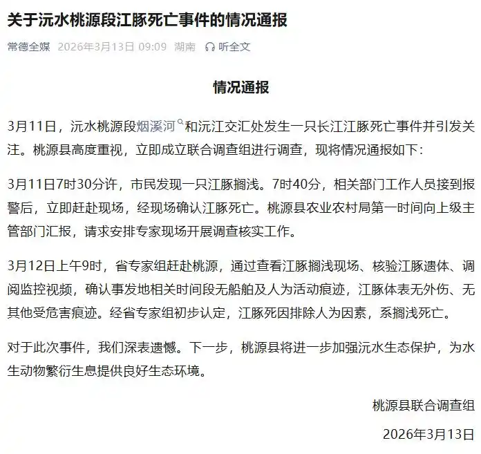 荔枝新闻讯 3月13日,桃源县联合调查组发布关于沅水桃源段江豚死亡事件的情况通报,内容如下: