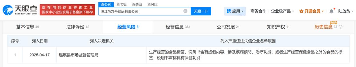 天眼查经营风险信息显示,该企业还因“生产经营的食品标签、说明书含有虚假内容,涉及疾病预防、治疗功能,或者生产经营保健食品之外的食品的标签、说明书声称具有保健功能”,于去年4月17日被遂溪县市场监督管理局列入严重违法失信企业名单。