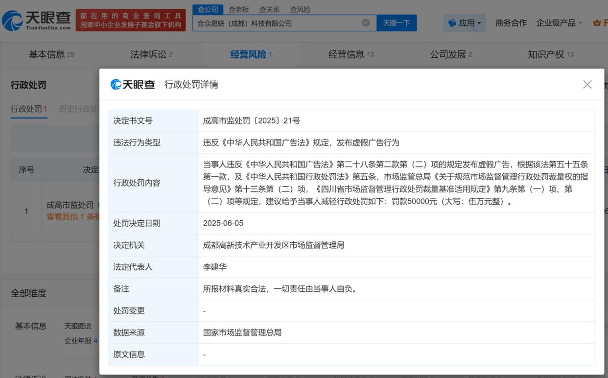 而另一家“合众易联(成都)科技有限公司”则因“违反《中华人民共和国广告法》规定,发布虚假广告行为”,被成都市高新技术产业开发区市场监督管理局处以5万元罚款。