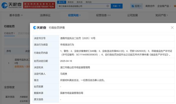 不仅如此,天眼查行政处罚信息显示,同样被315曝光的“泡药”虾仁涉事企业“湛江中青海洋水产有限公司”和“湛江良基冷冻食品有限公司”,都被相应市场管理局处以“没收涉事商品和违法所得、吊销食品生产许可证、百万级别罚款”等处罚。