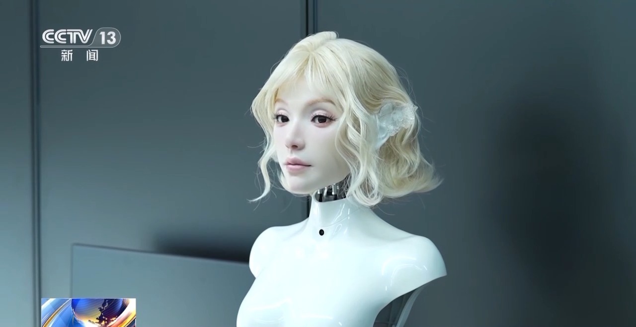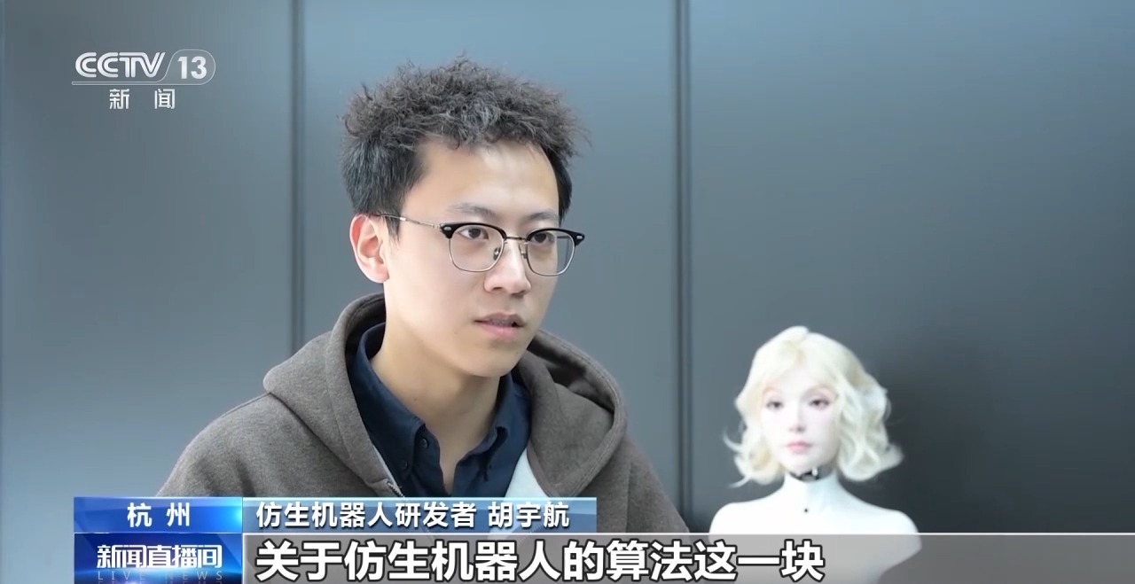 仿生机器人研发者 胡宇航:关于仿生机器人的算法这一块目前在世界或者国内都是比较空白,所以我们主要探索的是用大模型和具身智能算法,让机器人表情更仿生,更像人。