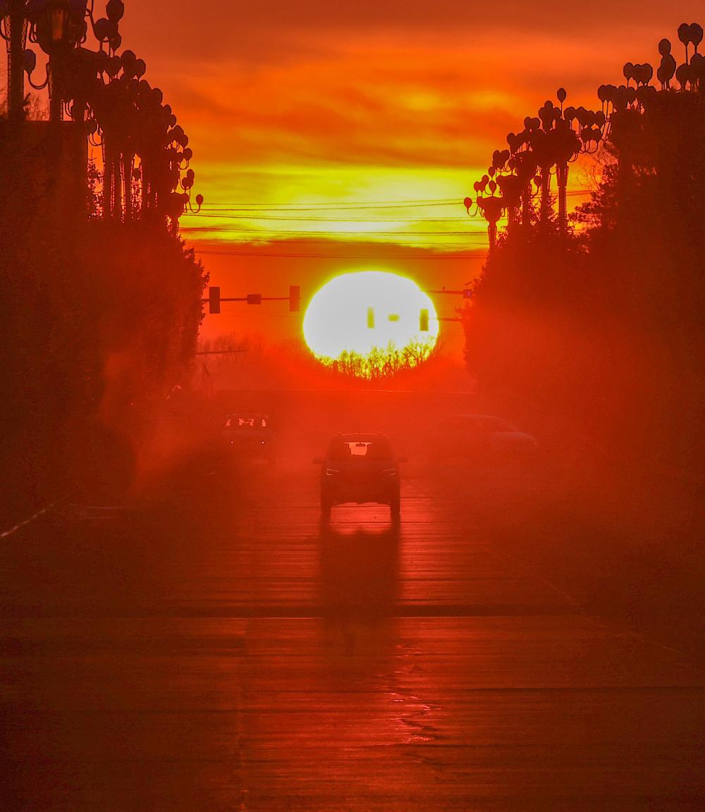 地球绕太阳公转时,太阳直射点在南北回归线之间移动,使得太阳升起和落下的方位在一年中呈周期性变化。当城市街道走向与太阳出没的方位角一致时,太阳会恰好出现在街道尽头正上方的地平线上,形成悬日景观。