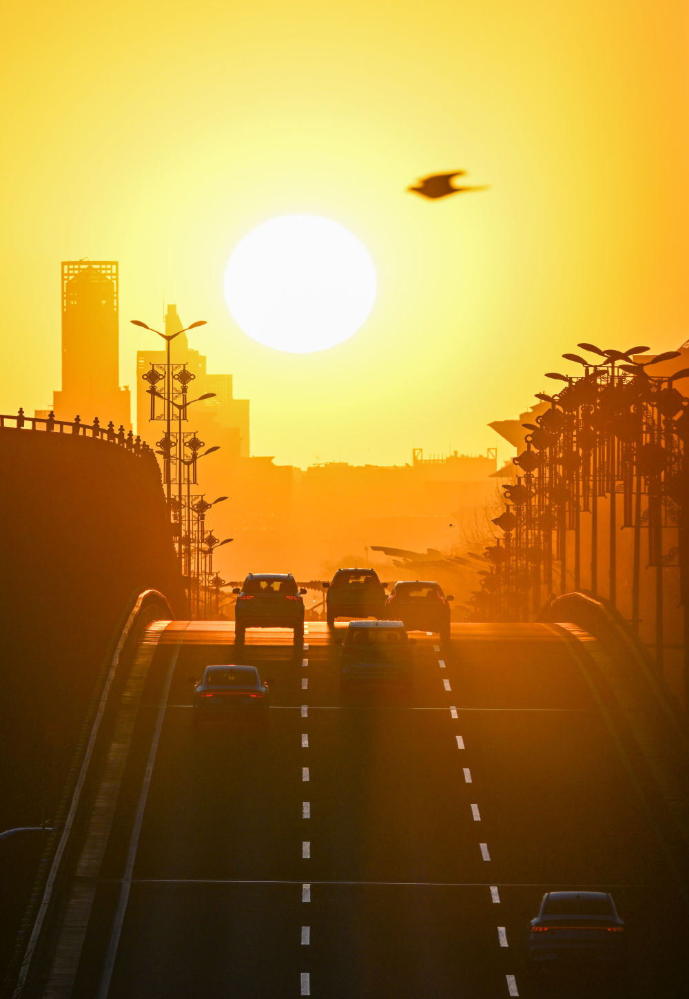 如何拍摄出春分悬日的风光大片?在北京工作的天津天文摄影爱好者钟奕表示,天气是关键。晴朗少云、大气通透的日子,能让太阳轮廓更清晰、色彩更鲜艳。除了好天气,精心的准备与合适的器材也至关重要。“通常需要一支600毫米左右的长焦镜头。拍摄时,可选取车流、行人或标志性建筑作为前景。如果想拍摄到太阳与特定建筑物交会,则需要通过专业软件精确计算,从而确定最佳拍摄位置。”钟奕提示说。