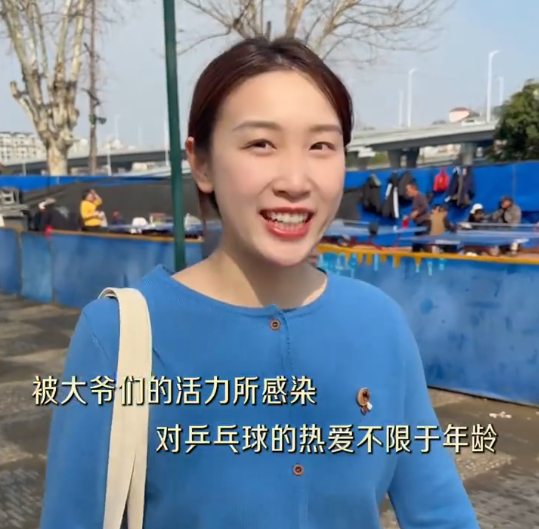 她遇到一位模仿樊振东动作的球迷大爷,还在乒乓球区与大爷们切磋球技。她还记录了单杠压腿拉伸、用石头自制滑石粉、80公斤负重举铁等硬核晨练的爷爷奶奶,感慨热爱不限于年龄。