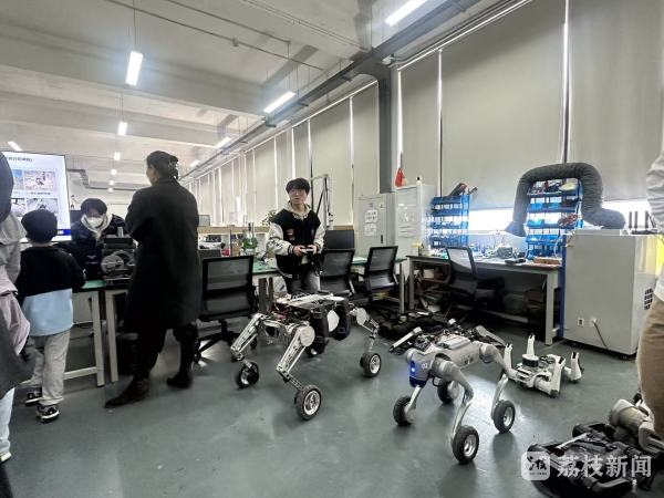 南京理工大学具身智能机器人团队负责人王禹林说:“我们团队老师带学生自主研发的重载四轮足机器人,从整个本体的正向设计到相应的各种作业感知、决策整个一体化,可以适应各种复杂场景。比如上面加机器臂就可以移动抓取,加各种相机、雷达等,就可以做各种巡检。像之前南京这边有野猪出没,也可以帮忙赶野猪,用途非常广,适用于各种复杂的地形。”