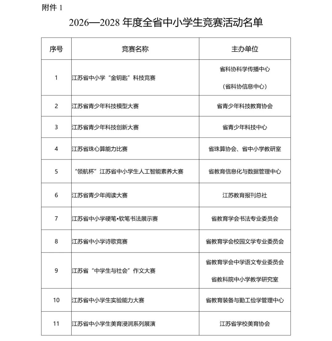 江苏省教育厅公布2026—2028年度全省中小学生竞赛活动