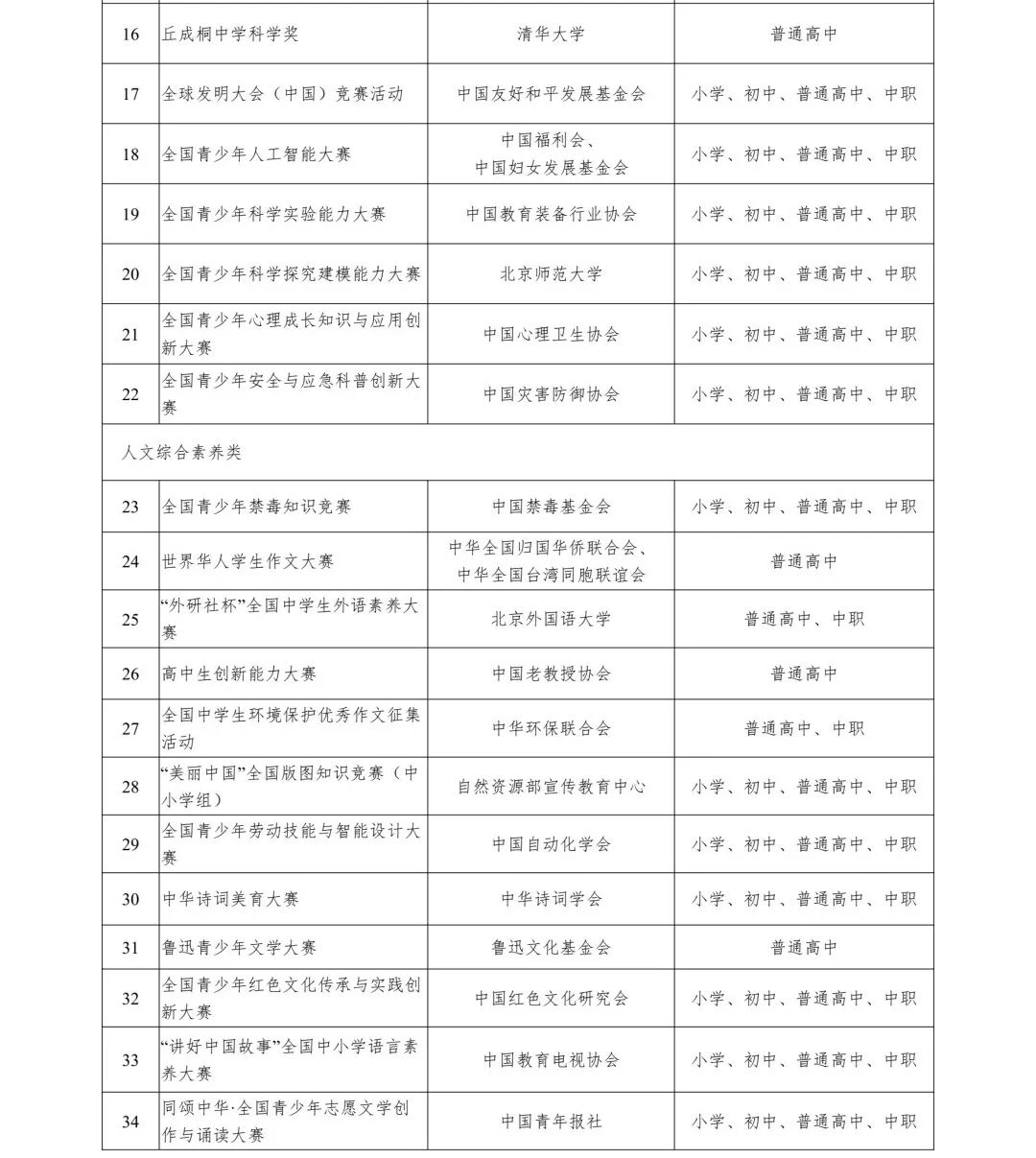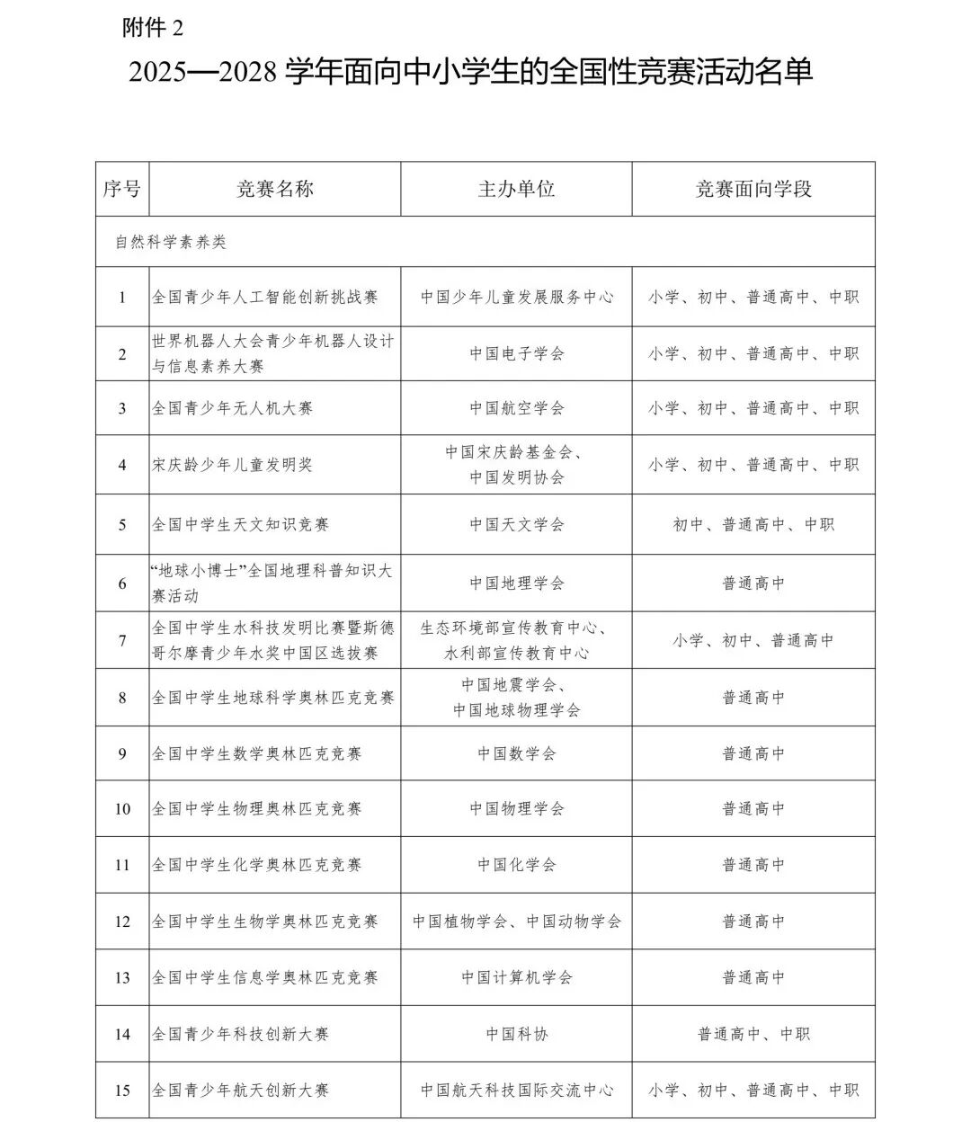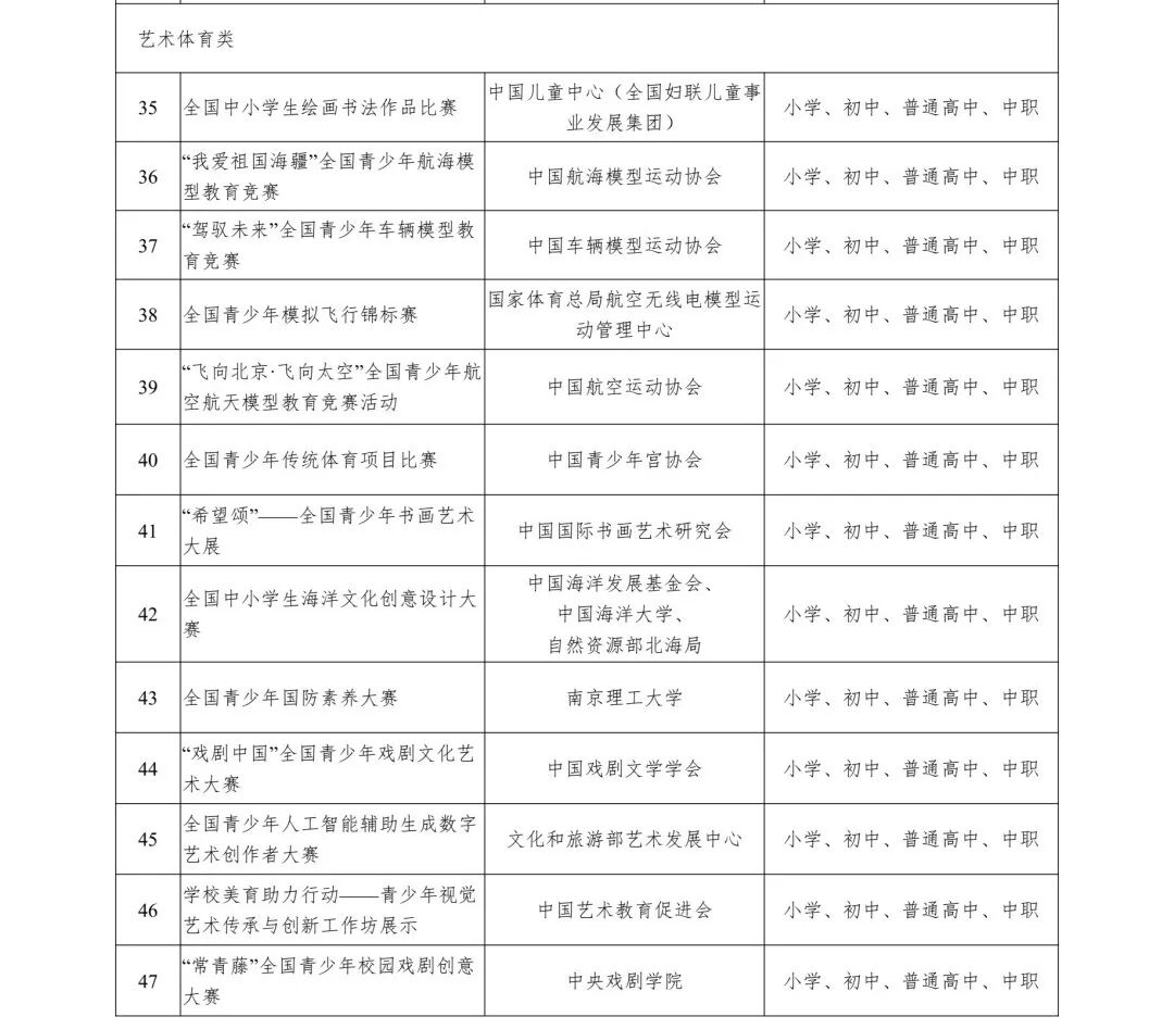 为贯彻落实《教育部办公厅等四部门关于印发〈面向中小学生的全国性竞赛活动管理办法〉的通知》(教监管厅函〔2022〕4号,以下简称《管理办法》)精神和《教育部办公厅关于公布2025—2028学年面向中小学生的全国性竞赛活动的通知》(教监管厅函〔2025〕7号)精神,现将省教育厅审核通过的2026-2028年度全省中小学生竞赛活动名单(见附件1)和我省中小学生参加的全国竞赛活动名单(见附件2)予以公布,并就进一步加强全省中小学生竞赛活动规范管理工作通知如下。
