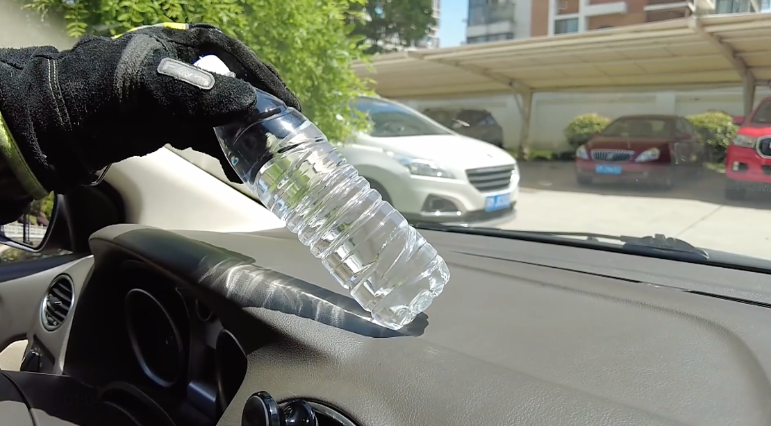 这类具有凸透镜效果的物品,若放置在车内阳光直射处,会像放大镜一样聚集光线,长时间照射容易引燃车内可燃物。