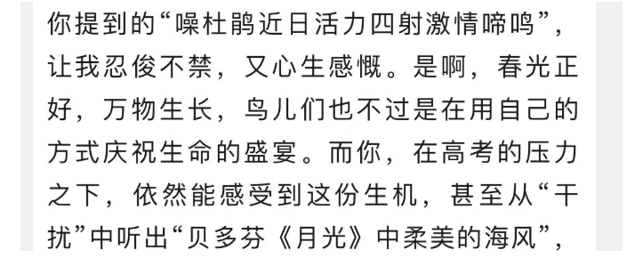 备考路上学会与干扰共处、与自然相融,焦灼中依然能发现生活之美的诗意,对生命的敬畏与善意,都会成为学子跨越山海的底气。愿备考学子能在鸟鸣声中沉静执笔,听见生命深处的回响;愿校园都能成为自然与人文共生的沃土,让教育在与世界的相拥中,绽放动人光彩。