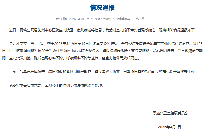 荔枝新闻讯 据恩施州卫生健康委员会官网4月1日消息,近日,网络出现恩施州中心医院金龙院区一患儿病逝等信息,我委对患儿的不幸离世深感痛心,现将相关情况通报如下: