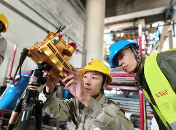 2024年4月23日,中国核电工程有限公司的企业导师和项目负责人现场指导朱澳(左一)。(李海萁 摄)