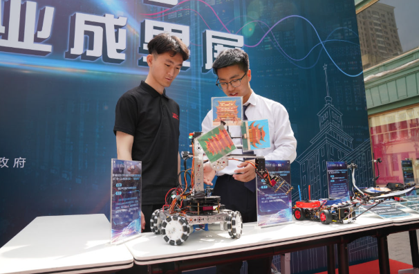 2024年5月13日,在哈尔滨工业大学学生创新创业成果展现场,参展团队成员展示一款智能车。新华社记者 王松 摄