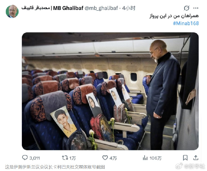 伊朗首席谈判代表、伊朗议会议长卡利巴夫当天在自己的社交媒体账号发了一张让人动容的照片,配文“我的飞行同伴们”。