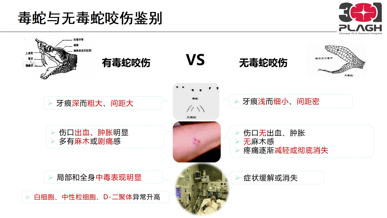 而毒蛇需将毒液注射至动物或人体内,因此长有尖牙,被其咬伤后牙痕深而粗大、间距大,会出现肿胀、麻木、剧痛,伤口可能伴有出血,局部乃至全身中毒症状明显。