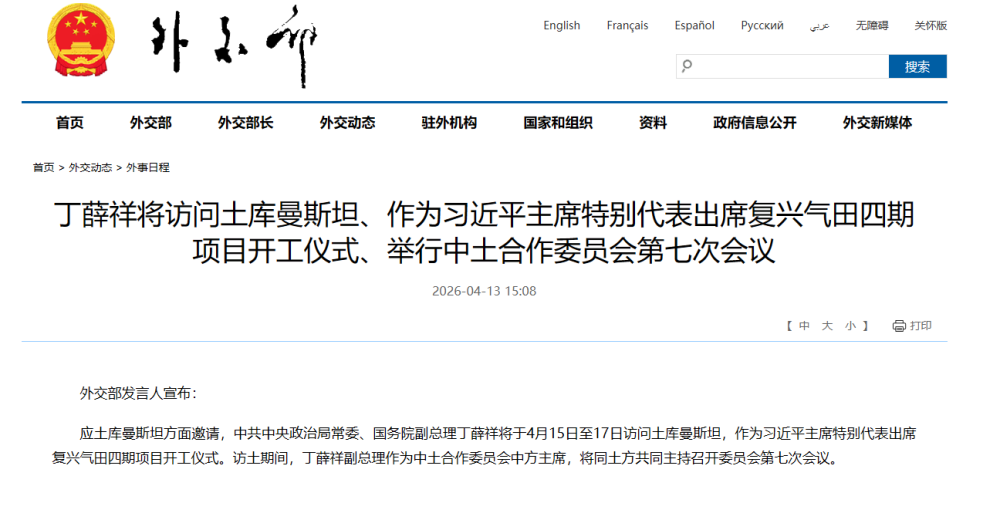 应土库曼斯坦方面邀请,中共中央政治局常委、国务院副总理丁薛祥将于4月15日至17日访问土库曼斯坦,作为习近平主席特别代表出席复兴气田四期项目开工仪式。访土期间,丁薛祥副总理作为中土合作委员会中方主席,将同土方共同主持召开委员会第七次会议。
