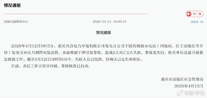 2026年4月12日9时5分,重庆兴涪电力开发有限公司发电分公司下属青烟洞水电站(四级站,位于涪陵区青羊镇)发电引水压力钢管突发迸裂,水流喷涌下泄引发事故,造成2人死亡2人失联。事故发生后,相关单位迅速开展紧急救援工作。截至4月12日18时50分许,失联人员已找到、经确认已无生命体征。