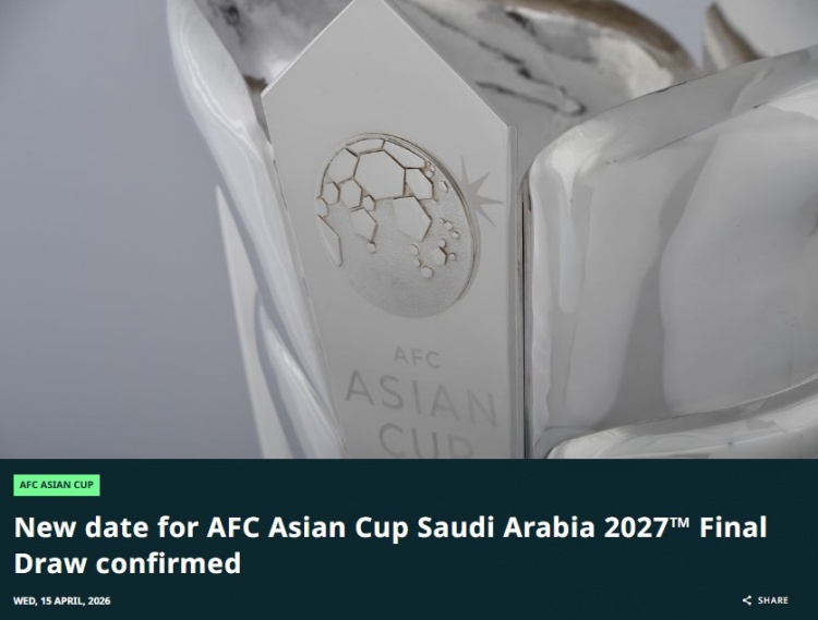 4月15日,亚足联发布官方消息,2027年亚洲杯抽签仪式将于2026年5月9日在利雅得进行。