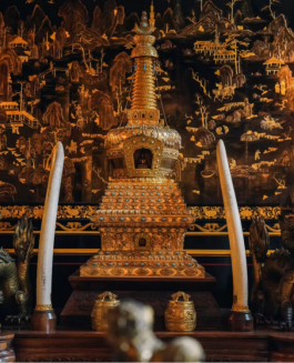 原置于正大光明殿皇帝宝座前,通体鎏金、雕饰繁复,高约2米,是清代佛造像与金属工艺的巅峰之作。