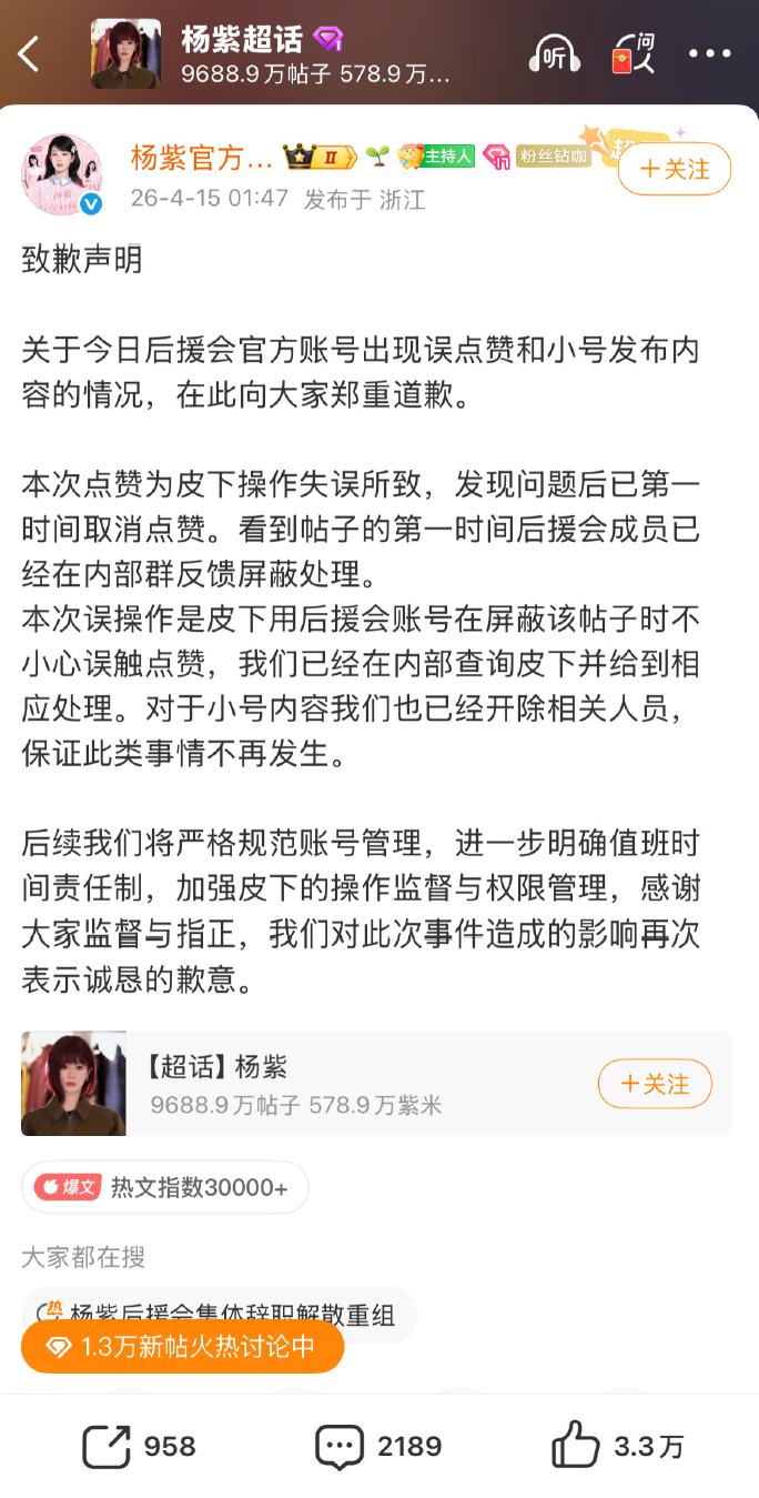 近日,微博@杨紫官方后援会被粉丝发现点赞了一则带有杨紫负面倾向的微博,杨紫官方后援会迅速以运营人员的“手误”回应。