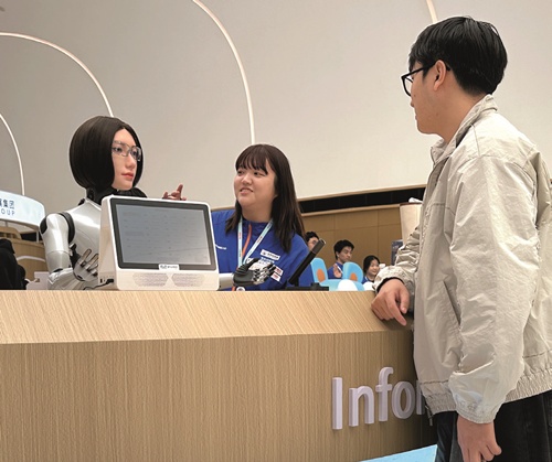 2026中关村论坛年会现场,咨询台的机器人向参会人员提供服务。(图/刘烨烨)