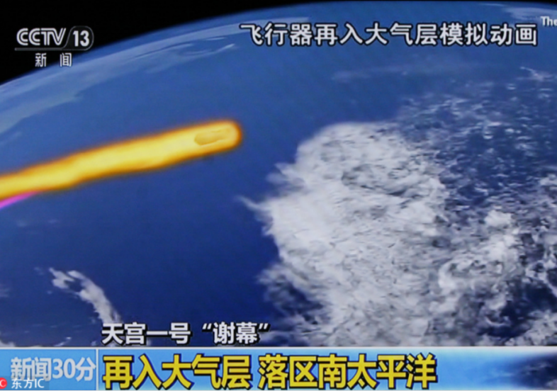 8时15分左右,天宫一号目标飞行器再入南太平洋中部区域,大部分器件在大气层中烧蚀销毁。