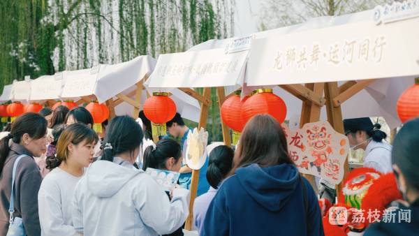 热闹的氛围也吸引了不少正值春假的孩子们参与。他们在生物与化工工程学院的展台品尝改良版的淮扬美味,跟着纺织服装学院师生学习蜡染技艺,亲手将“运河十二景”染进香囊等文创产品中。