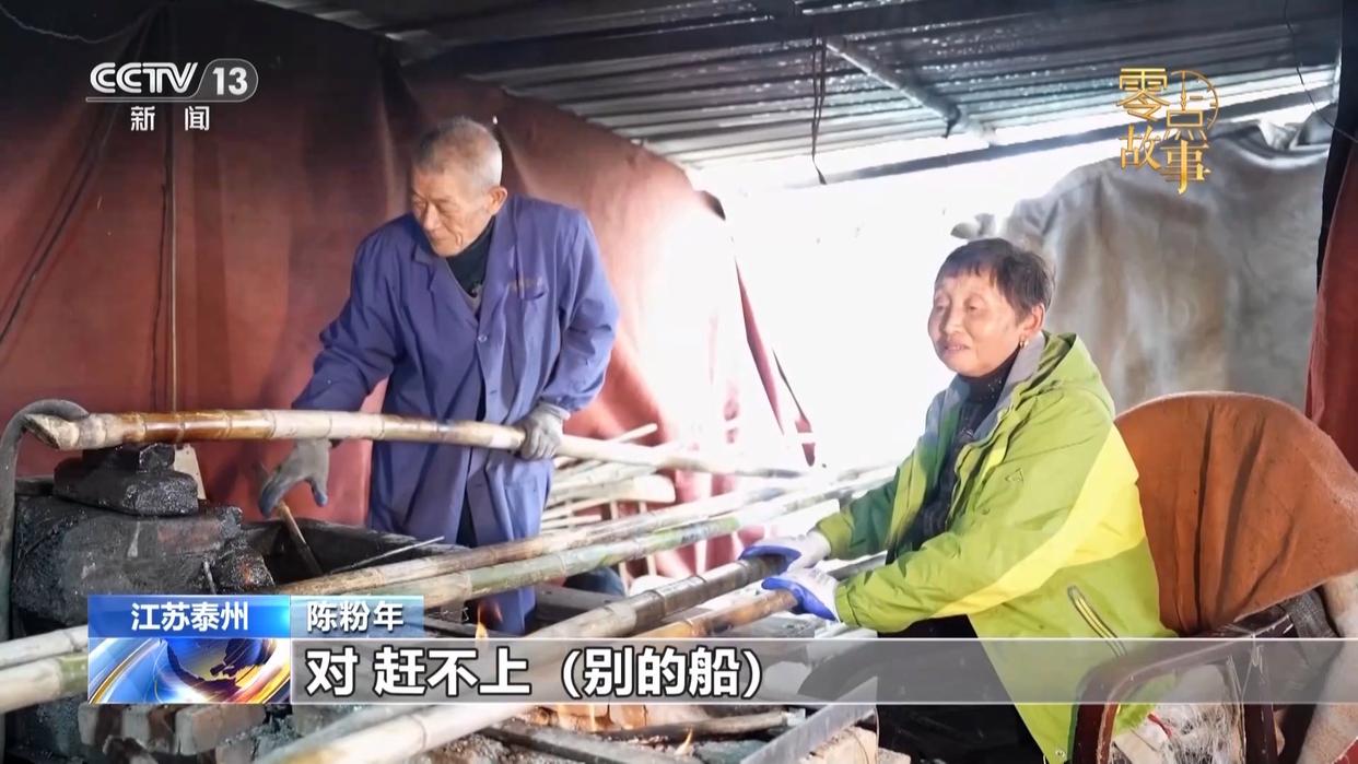 陈粉年:儿子就说我们两个人太辛苦。他说,你要多少钱,我养你们。我就说,溱潼会船数第一,这个篙子的活不能拒绝,八家作坊就剩我们一家。我说不喊苦。怎么办,就学的这个手艺,吃的这个饭,40年了,我们做了40年。
