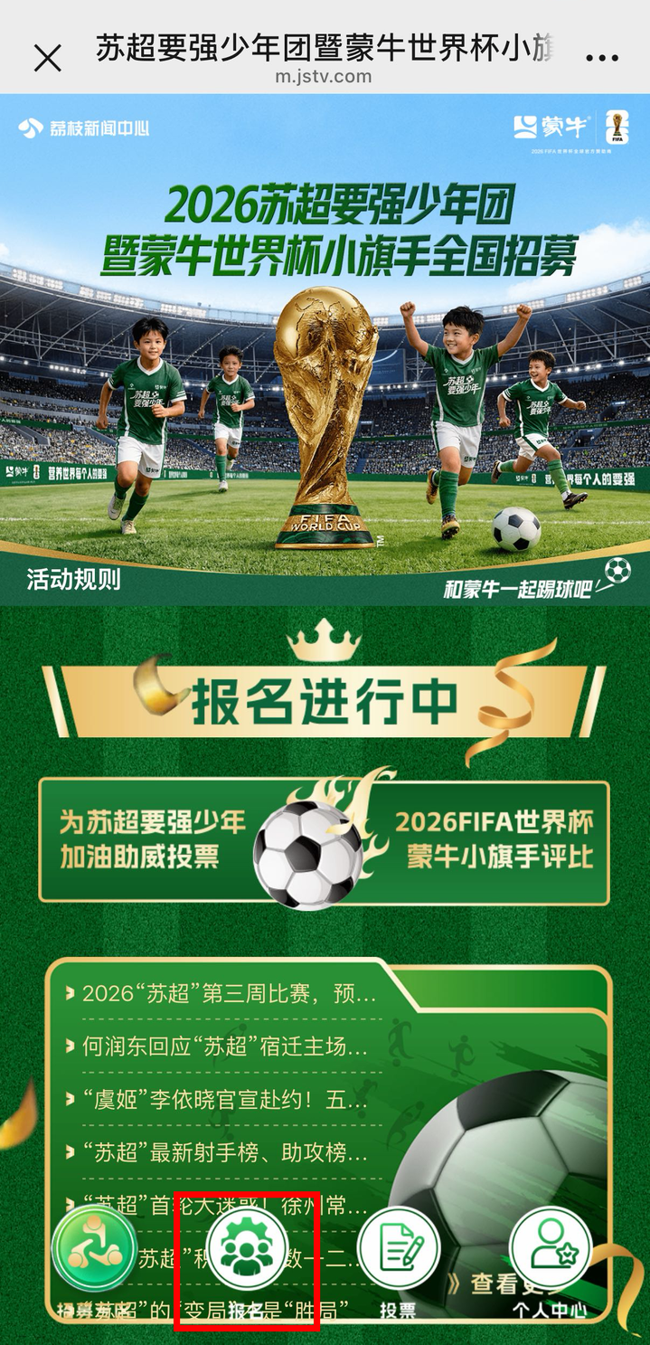 活动分为“网络报名→苏超要强少年团评选→蒙牛世界杯小旗手评选”三个阶段,由监护人按平台提示填写信息、上传材料,审核结果1-3个工作日会短信通知,一次报名就能参与多期评选,未入选自动顺延,不用重复报名~