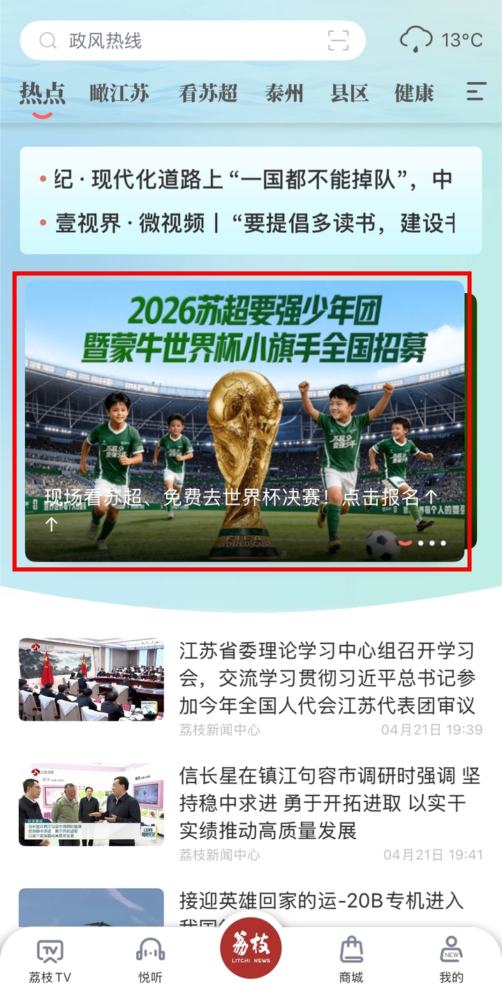 1. 下载并打开“荔枝新闻”APP,点击首页上方的图片“苏超要强少年团招募专区”(红框部分)即可