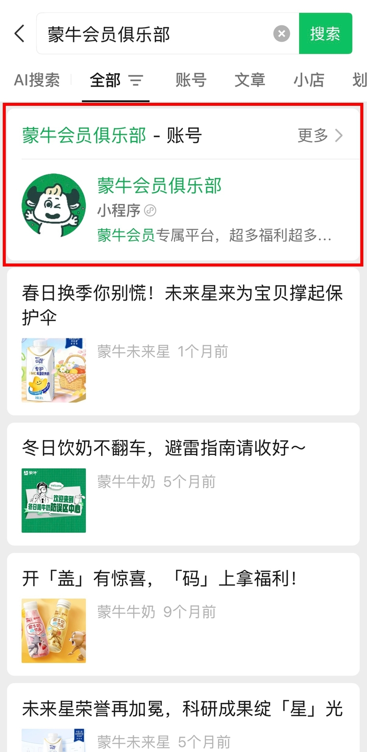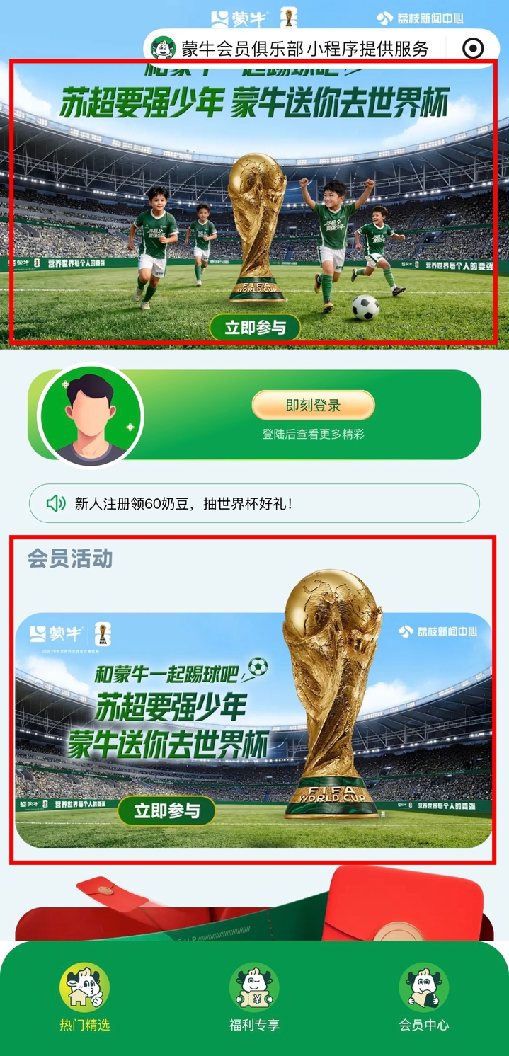 2. 微信搜索并进入“蒙牛会员俱乐部”小程序,点击页面醒目位置的“苏超要强少年团招募专区”(红框部分)即可