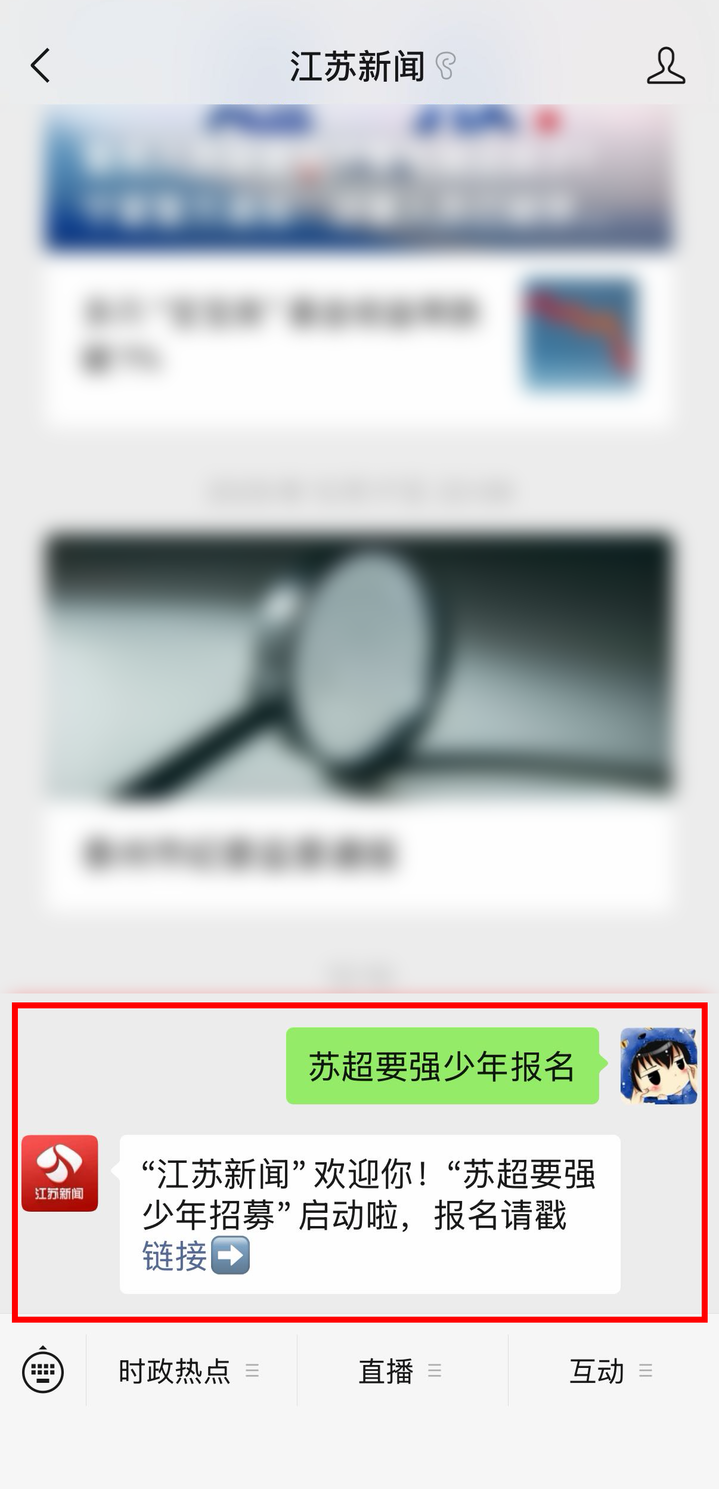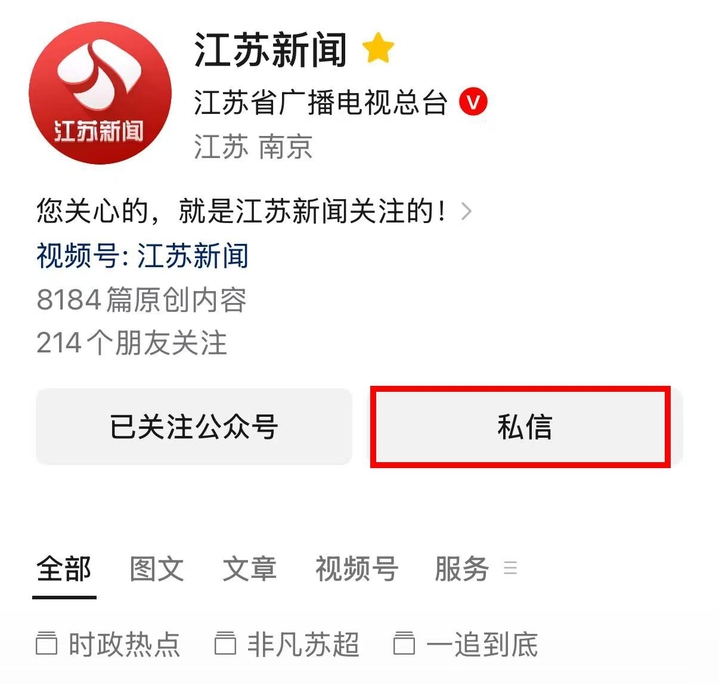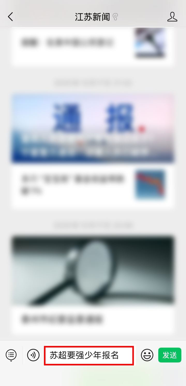 3.微信搜索并关注“江苏新闻”公众号,关注后点击“私信”,在消息框中输入并发送文字“苏超要强少年报名”,即可收到报名链接