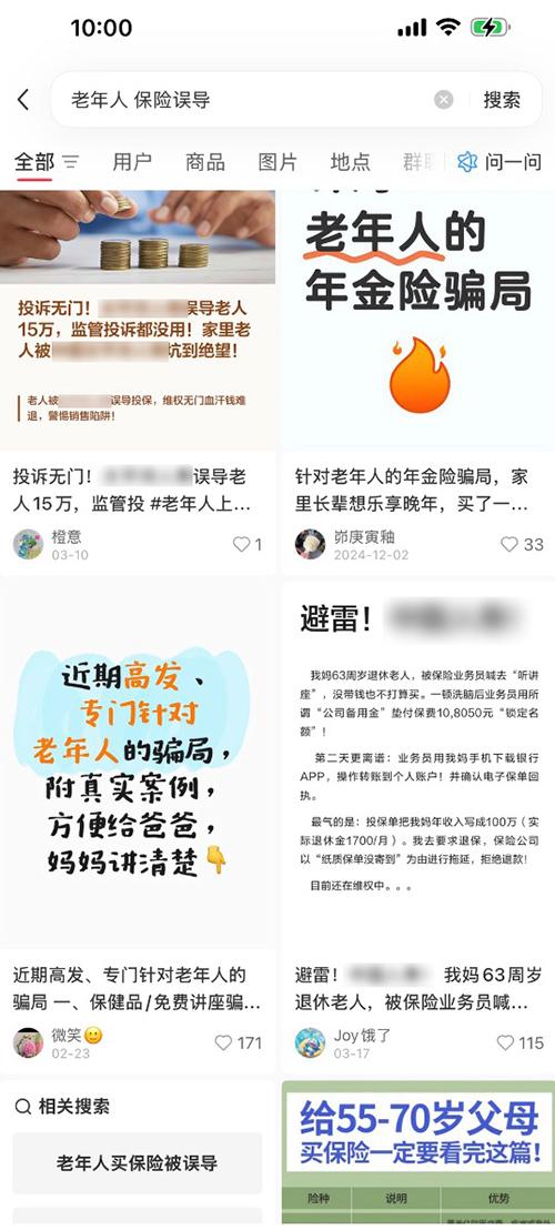 记者在某社交平台以“老年人”“保险误导”为关键词检索发现,多条热门帖文均反映老人遭遇保险误导销售,最终购入远超自身经济承受能力的高额保单,取证维权艰难,受损失不小。