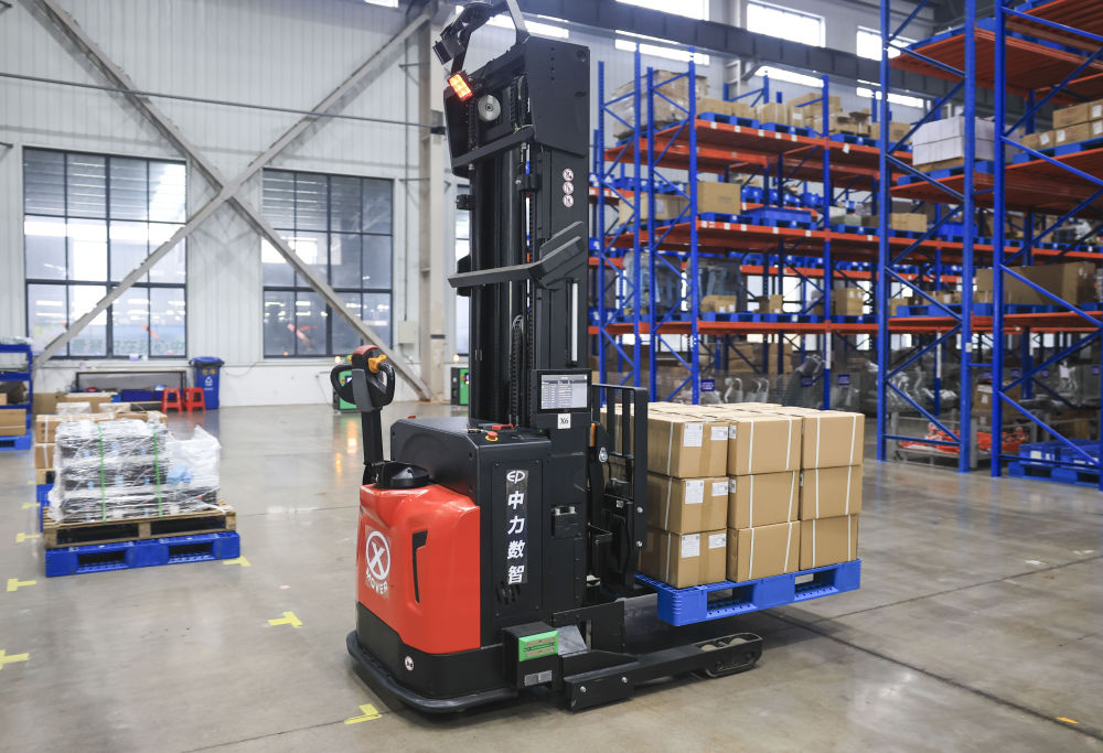 江苏中力叉车有限公司的厂房里,一辆辆搬运叉车平稳地穿梭于厂区、货架间,只走一遍规划路径就能自动记忆路线,实现无人化智能搬运——这是企业最新研发的产品,给叉车装上了“AI大脑”。