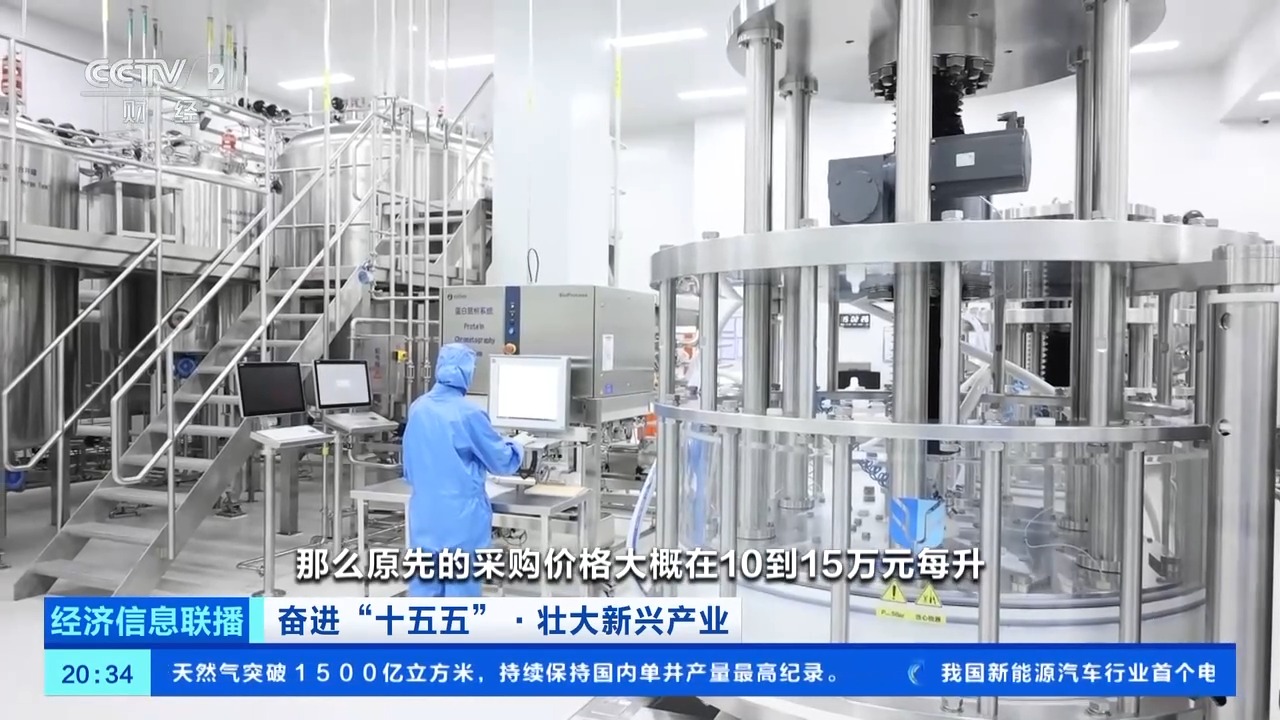 总台央视记者 姜美羊:在正大天晴顺欣制药的万升级生物药生产车间,这一台一万升的不锈钢生物反应器,是国内第一条获批上市的万升级生物类似药生产线。像这样的一万升生物反应器,这里已经建成了6个。万升产线在管罐系统、培养基、填料和纳滤膜等关键设备和耗材方面攻克了多项核心技术壁垒和“卡脖子”难题,打破了国外垄断,整体国产化率超过90%。