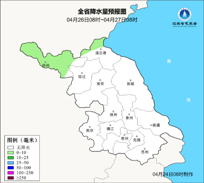 4月24日08时至4月25日08时,全省晴到多云。今天最高温度:全省21~22℃;明晨最低温度:淮北和江淮之间东部地区8~9℃,其他地区10~11℃。全省偏东风3-4级。