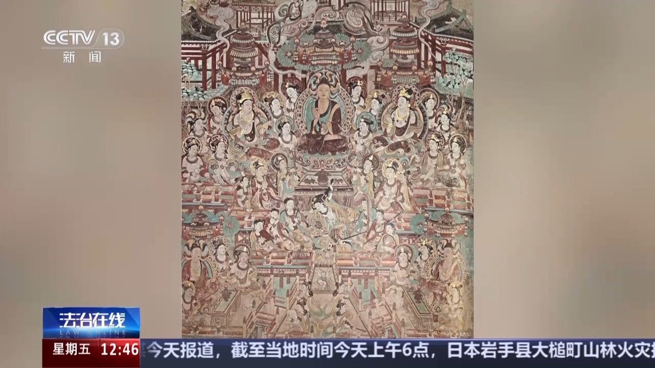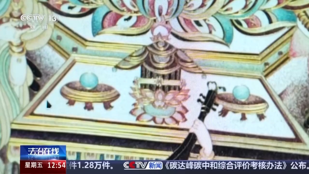 画面中这幅精美的画作,是画家高先生依照敦煌莫高窟第112窟壁画《观无量寿经变》绘制而成。原作因墙皮脱落、颜料风化、掉色变色等原因造成的残缺,高先生都进行了补足。画作完成后,一家文化公司获得了它的独占许可授权。