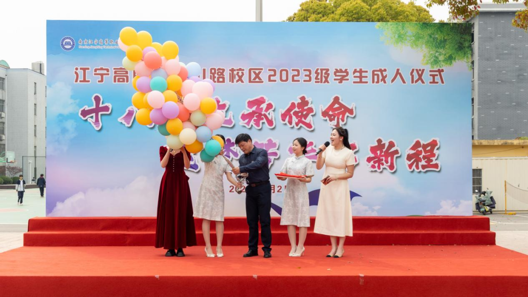 南京江宁高等职业技术学校副校长孙旺利致辞,向同学们提出“学会担当、坚守善良、终身学习”的三点期望。致辞结束后,全体学生放飞彩色气球。