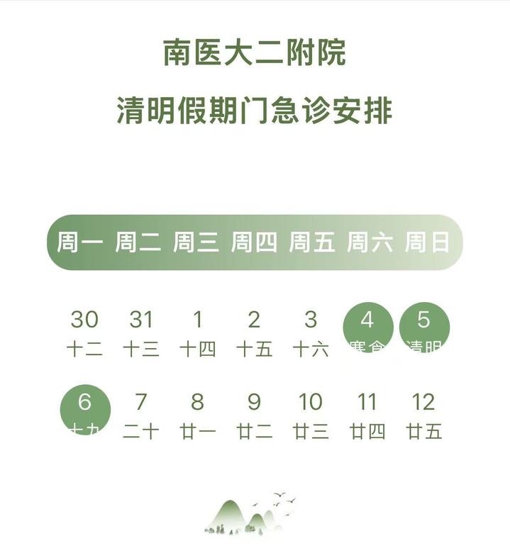 一、放假时间:4月4日-4月6日。4月4日、5日分别按周六、周日门诊排班,4月6日按周一门诊排班。相应的辅助、功能科室、窗口、导医、物业、保安等对应门诊医师排班进行排班;