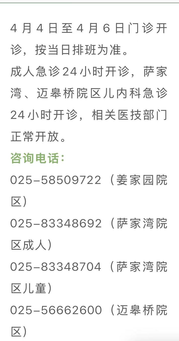 清明期间,全省所有医院急诊科24小时开放,二级以上综合医院、中医院、儿童医院将合理安排门诊,并及时向社会公布开诊安排,方便群众就医。呼吸科、儿科、感染科、胸痛、卒中、创伤等科室和救治中心将配齐配强医护人员,在岗在位,为患者得到及时有效救治提供保障。详细情况请参见各卫生健康机构门户网站、微信公众号。“健康江苏”微信公众号将持续发布省内部分医疗机构的门急诊安排。
