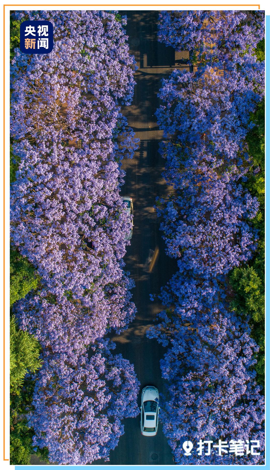 每年的4—5月,昆明教场中路约1.4公里长的道路上,550多株蓝花楹迎来盛放,形成一条蓝紫色的梦幻长廊,成为春城最具氛围感的浪漫地标。