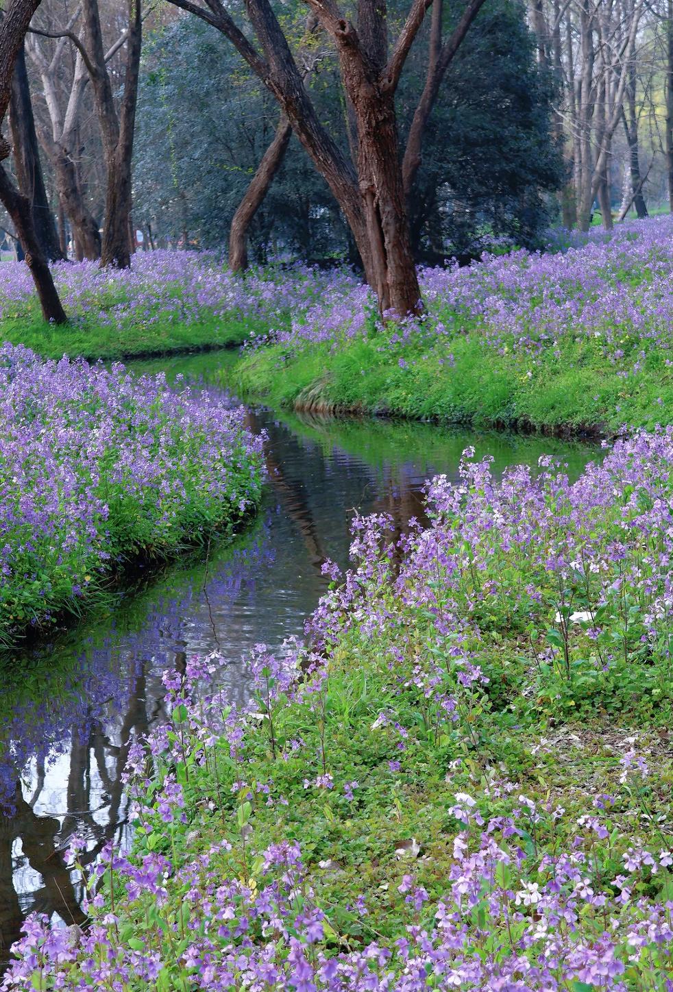 这时的扬州,春意正浓。市区里的宋夹城,迎来了一年中最梦幻的时刻——二月兰花海正值最佳观赏期。它们从林间铺展到溪岸,把整座园子晕染成了一座绚丽耀眼的莫奈花园。