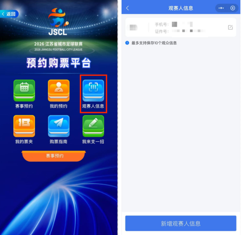 2.把观赛人信息提前填好。包括姓名、身份证、手机号等信息,每名用户最多可设置10位观赛人。
