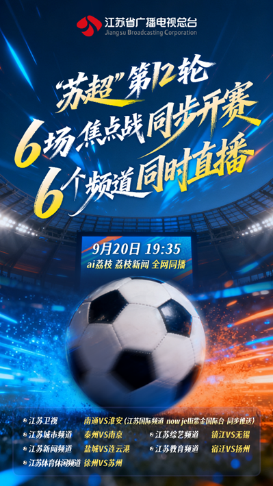 作为江苏省城市足球联赛(“苏超”)唯一公共信号服务机构,高质量完成85场直转播,为全国超百家媒体提供信号,江苏广电总台新媒体矩阵直播观看人次超10.5亿。首次调用8个电视频道同时直播6场赛事,被业界誉为“现象级赛事直播案例”。首创“一屏观六赛”多画面模式,首秀大屏弹幕功能。启用“飞猫”索道摄像、斯坦尼康稳定系统、机器狗等顶级设备,搭配28个超高清机位、6G传输、AR沉浸式制作,树立国内体育赛事转播新标杆。相关报道全网传播量超76亿,成功打造现象级文化体育IP。纪录片《问鼎》《顶流》展现“人民的苏超”生动画卷。《“苏超”:踢出一片新天地》入选中国记协“接续奋进的中国”融创精品地方媒体十大案例。《“苏超”国际范儿》等多语种系列短视频,海外浏览量超千万,多条被外交部发言人办公室及驻外使领馆X账号转发。苏超IP矩阵构建江苏人文经济发展新标杆,入选“第三批长三角人文经济典型案例”。