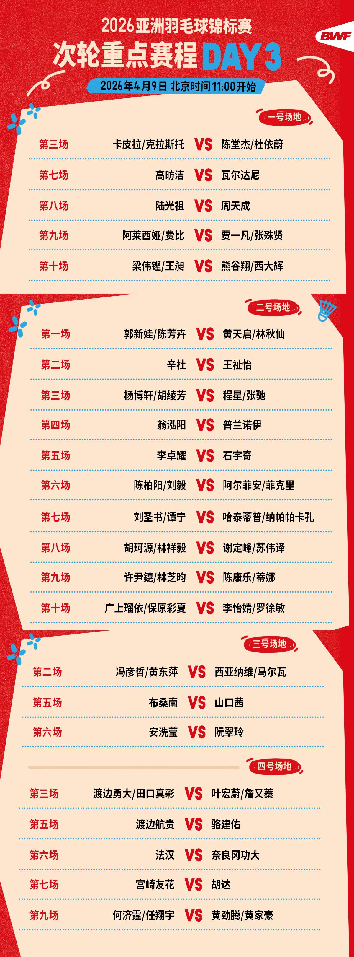 2026羽毛球亚锦赛第三日赛程公布 中午11时开打 央视新闻 2026-04-09 08:11 2026年亚洲羽毛球锦标赛今天(9日)迎来第三个比赛日,将于北京时间中午11时开赛。今日焦点战:石宇奇vs李卓耀、陆光祖vs周天成、高昉洁vs瓦尔达尼、胡珂源/林祥毅vs谢定峰/苏伟译。