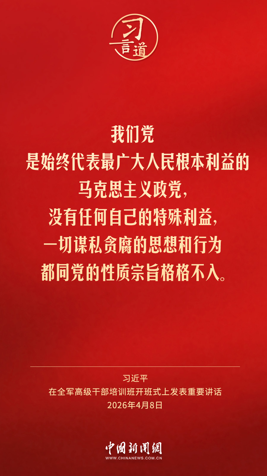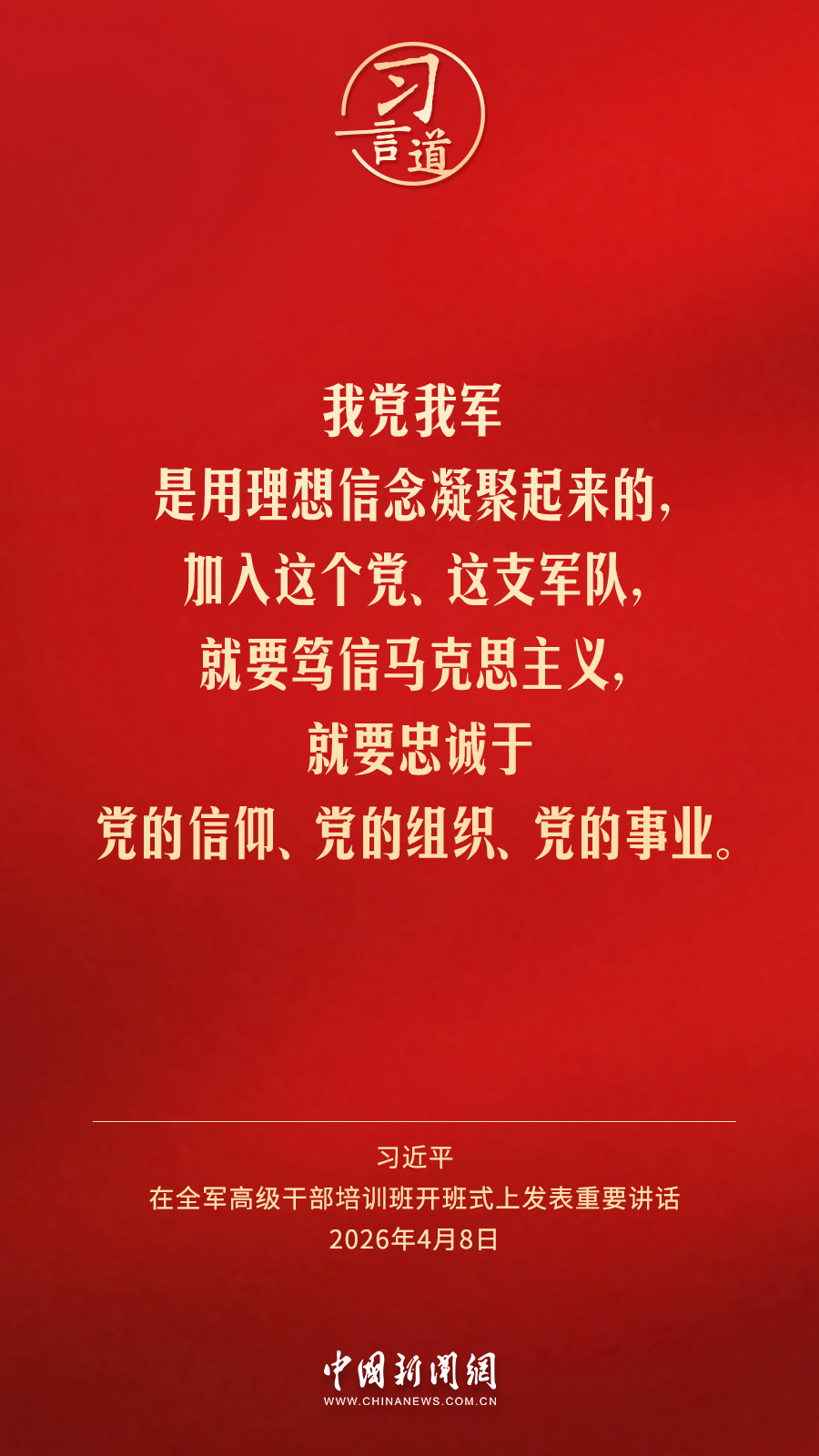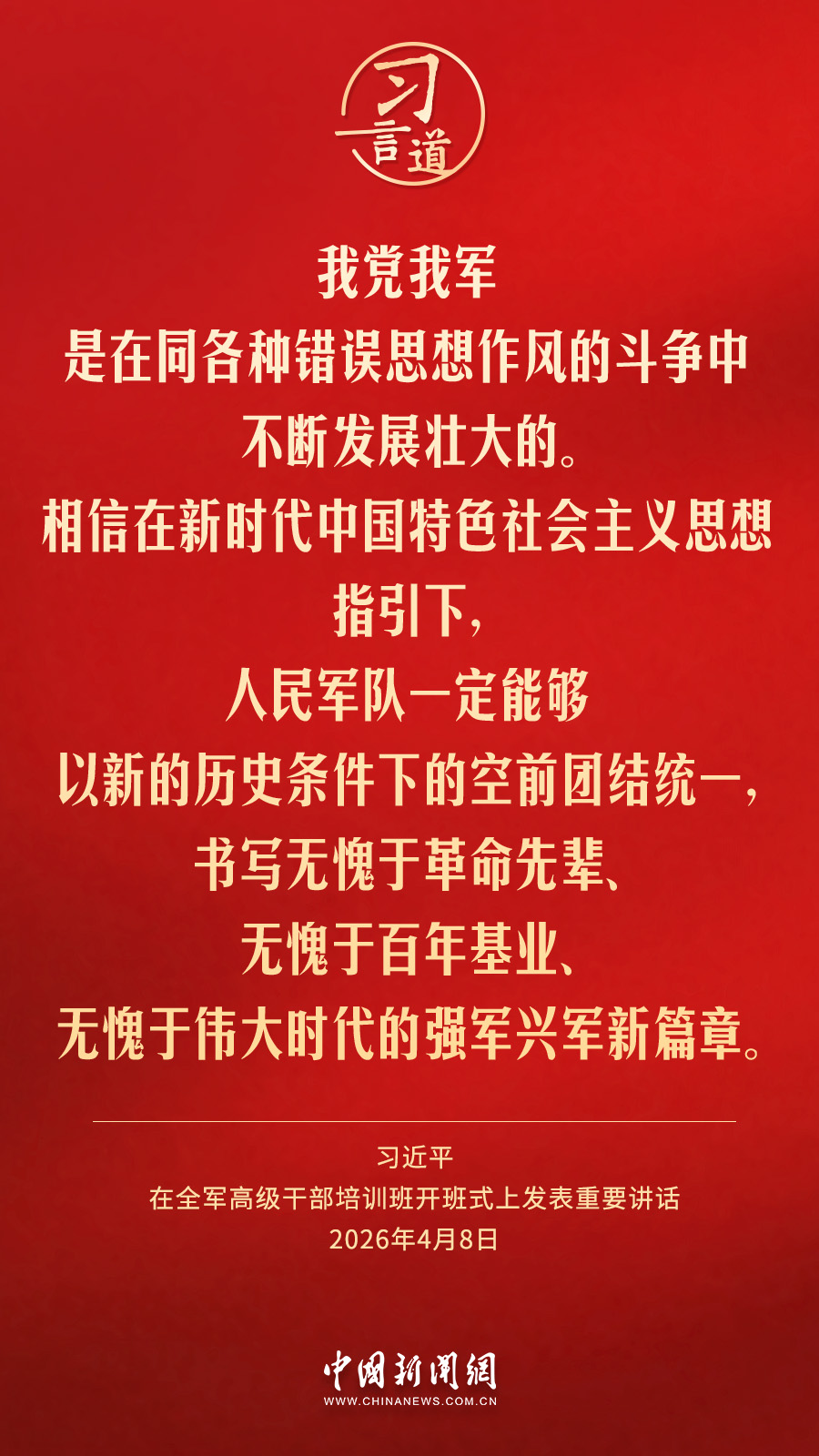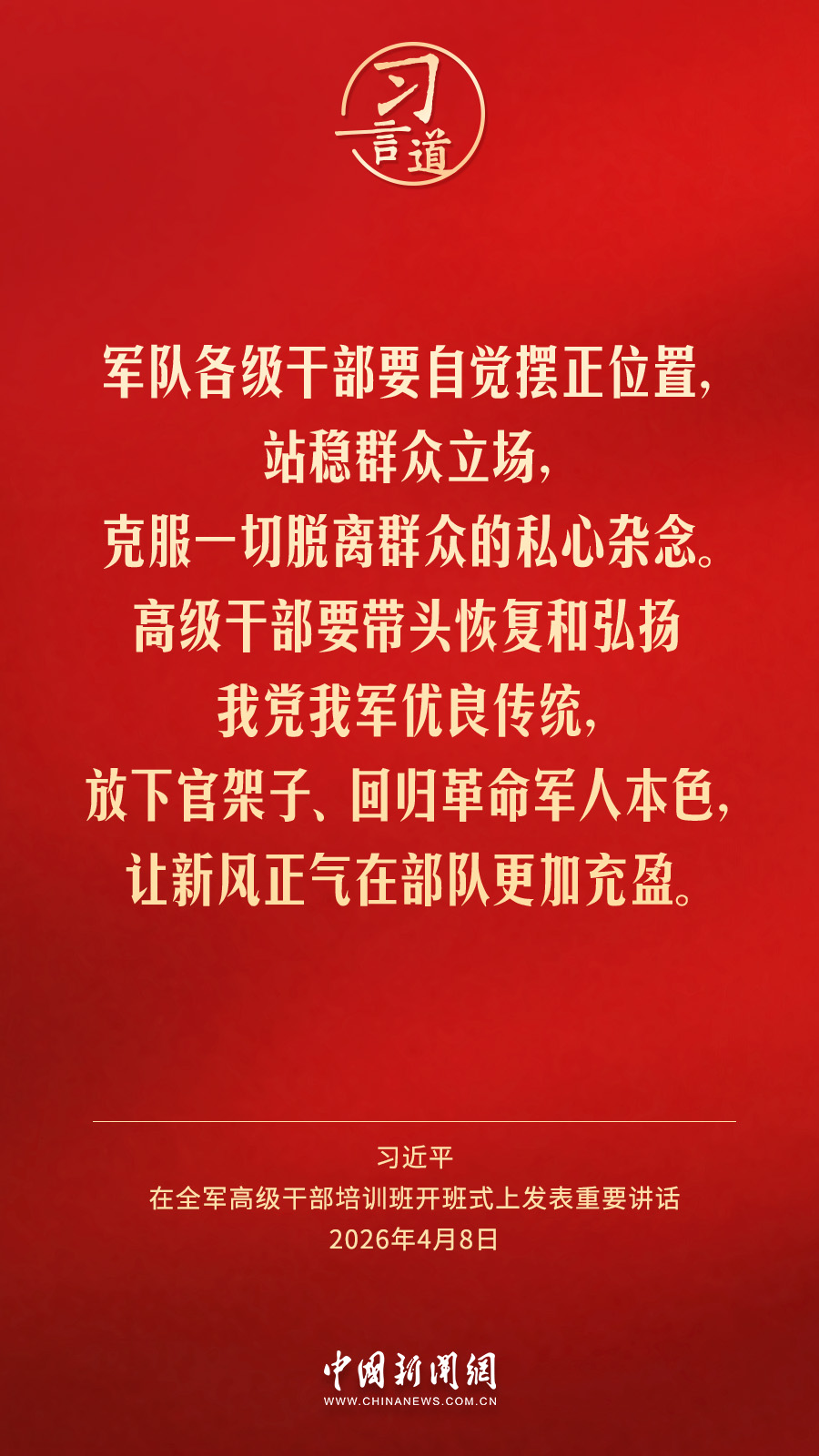 习言道|放下官架子、回归革命军人本色 中国新闻网 2026-04-09 08:48 全军高级干部培训班8日在国防大学开班。中共中央总书记、国家主席、中央军委主席习近平出席开班式并发表重要讲话。他强调——